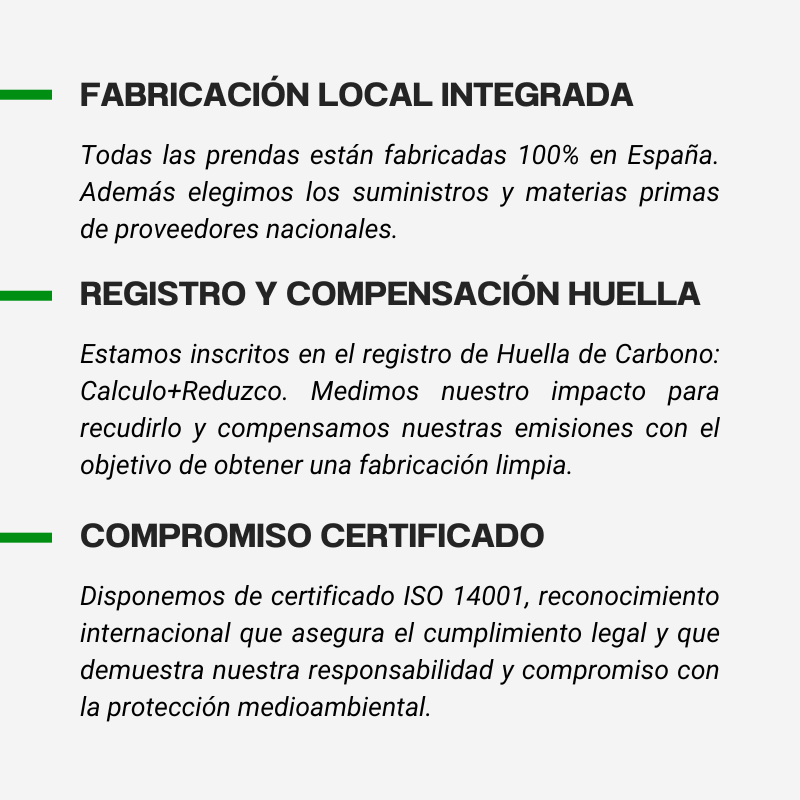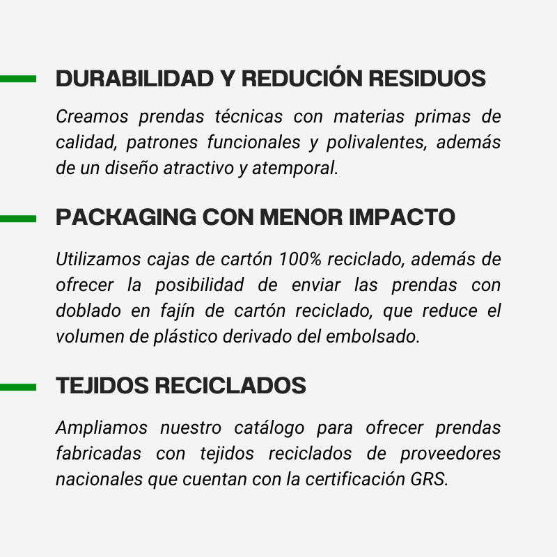 "En Teamergy vestimos con conciencia y compromiso. Fabricamos de forma responsable ropa deportiva funcional y duradera con un efecto positivo sobre la sociedad y el menor impacto medioambiental".